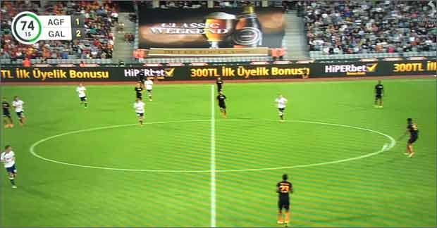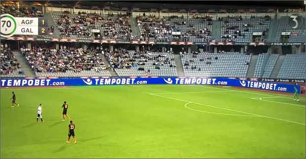 Billedtekst: I træningskampen mellem AGF - Galatasaray var der i strid med loven masser af reklame for bookmakere uden dansk licens. (Fra TV3 Sport 1)
