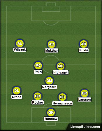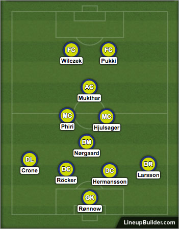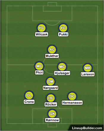 Her skubber man Hany Mukthar op mellem de to angribere, så det lidt ligner en 4-3-3. Her skal det også bemærkes, at Wilczek og Pukki ikke agerer kantspillere, men angribere, og derfor ikke hjælper Brøndbys backs, så meget som en kantspiller normalt ville gøre.