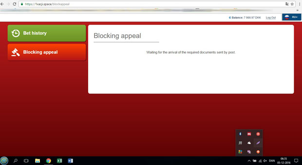 "Waiting for the arrival of the required documents sent by post." Sådan ser Morten Bechs suspenderede konto ved 1xBet ud for tiden.