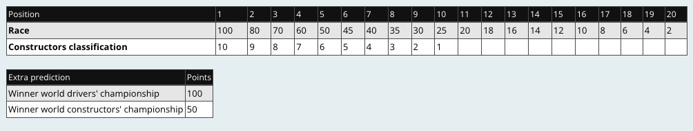 Pointsystemet er sådan set såre simpelt: Jo bedre din kørere slutter, desto flere point optjener du. Hvis vi ser bort fra muligheden for at score ekstra point ved at forudsige den vindende kører og det vindende hold, er der altså ikke meget hokus pokus ved denne konkurrence.