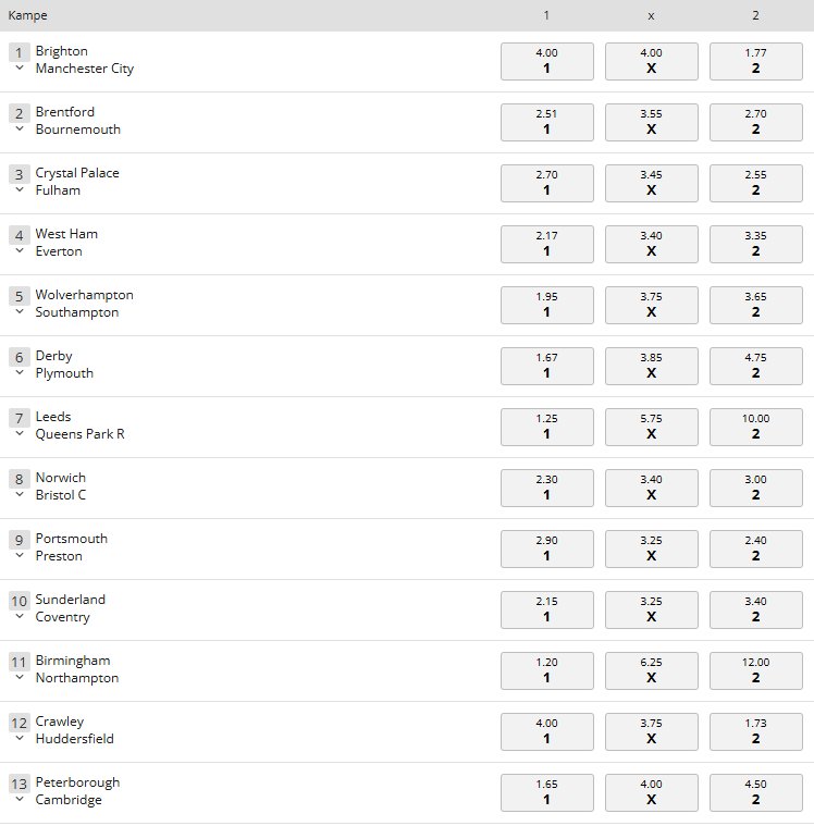 Her kan du se lørdagens Tips 13-kupon til engelsk fodbold. Du kan vinde 2 mio. kr., hvis du bliver en enlig 13´er. Bemærk, spilstop er lørdag den 9. oktober kl. 15.55.