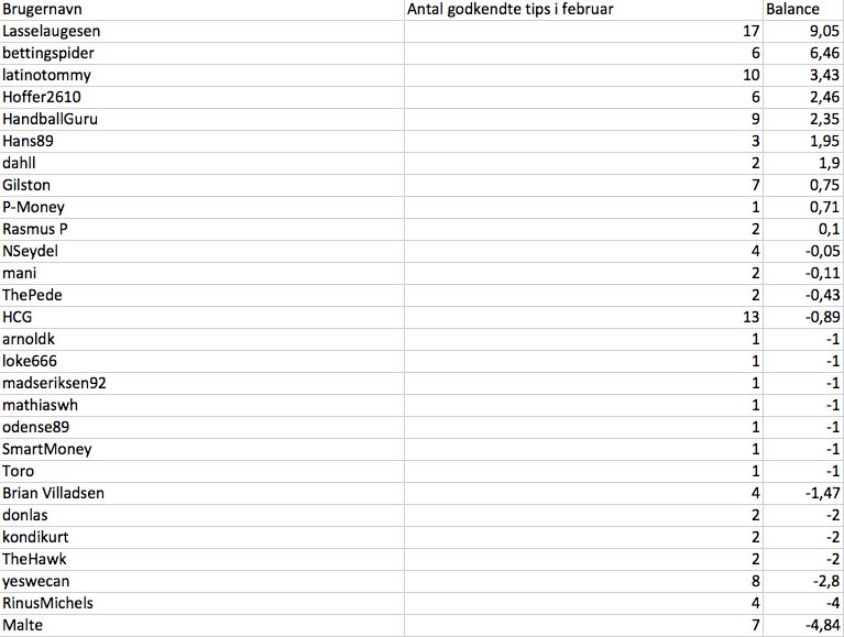 Hele stillingen for februar måned, hvor kun godkendte brugertips er talt med, kan ses nedenunder: