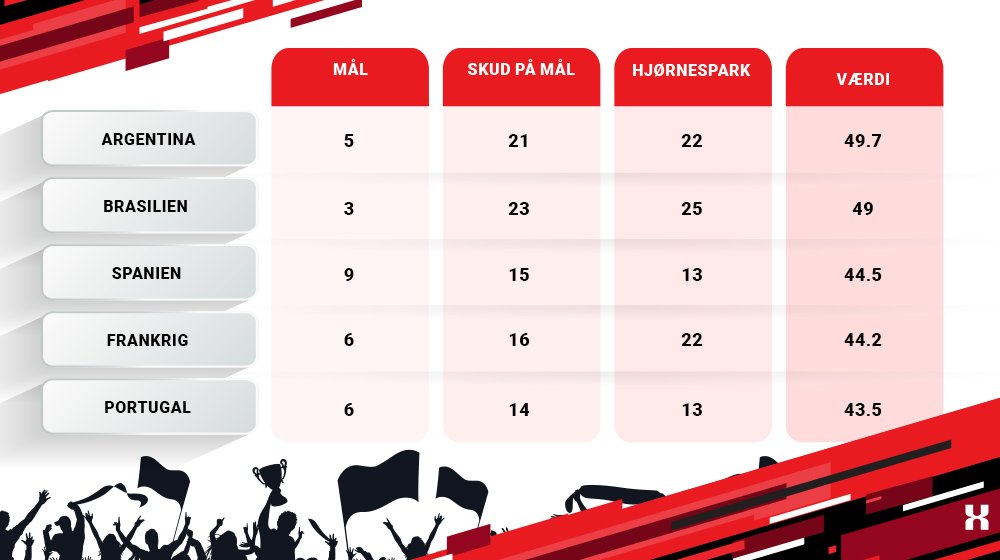 Her er oversigten over de fem hold, der har skabt mest i gruppespillet: