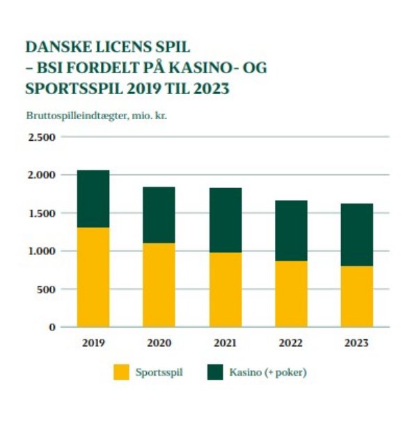 Ser vi på Danske Licens Spil med Oddset, Casino, Tips og Poker, så var der der en BSI i 2023 på 1.613 mio. kr., hvilket er et markant fald, da der i 2019 var en BSI på over 2 milliarder kr.