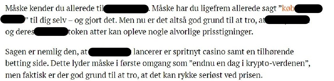 Der er valgt ikke at nævne den licensløse krypto-bookmaker, da vi ikke ønsker at give omtale. Samtidig har vi valgt denne gang ikke at nævne nyhedsmediet, der har bragt den ulovlige sponsorerede artikel, da vores fokus er på at oplyse om de risici, der er forbundet med at spille hos licensløse spiludbydere.