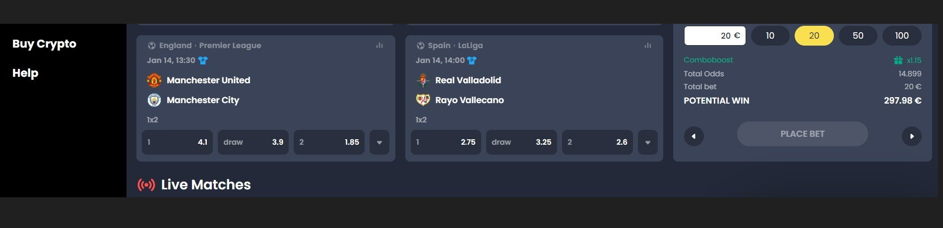Screenshot taget fra den licensløse krypto-bookmaker