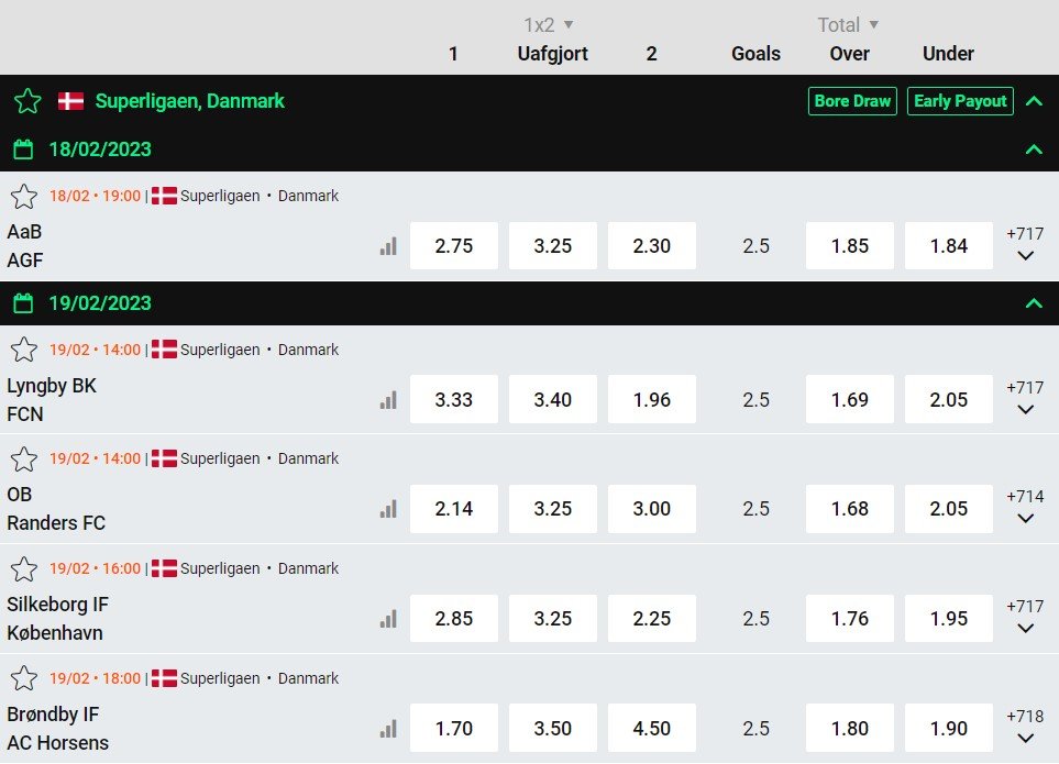 De har odds på alle de store ligaer som Premier League, La Liga, Serie A, Bundesligaen og Ligue 1. Dansk fodbold er også dækket ind med odds på Superliga, NordicBet Ligaen, DBU Pokalen, 2. division og kvindeligaen.