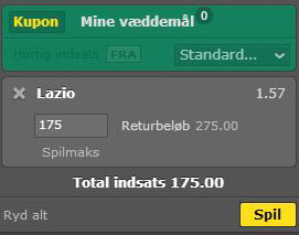 Billedtekst: Her ses et eksempel på limit på et stort marked. Det er fra opgøret mellem Lazio - Udinese i torsdagens Coppa Italia. Denne bettor kunne blot sætte 175 kroner hos Bet365*.