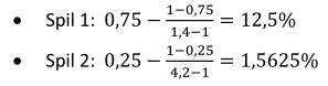Spil 1: 0,75 x 0,02 x 105 = 1,575% (Kelly-metode = 12,5%)