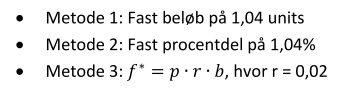 Risikofaktoren r=0,02 giver en gennemsnitlig indsats på 1,04%. For at udgangspunktet skal være det samme, er hhv. 1,04% og 1,04 units valgt til metode 2 og 1.
