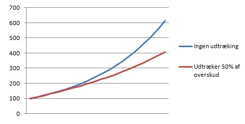 Herunder ses forskellen på hvordan to formuer udvikler sig over 20 år. Begge vokser med 10% årligt, men den ene trækker 50% af overskuddet ud og geninvesterer kun halvdelen.