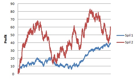 Selvom det forventede afkast af de to spil er præcis den samme, så er det tydeligt at se hvor stor forskel, der er på de enkelte grafer. Ved lav-odds spillet får vi et mere stabilt afkast uden de helt store udsving. Det betyder at vi kan risikere en større del af formuen, idet vi ved at risikoen for at mange tabte spil i træk er lille.