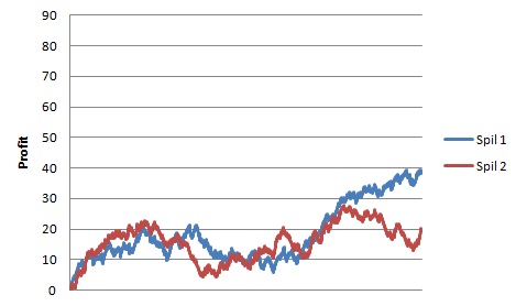 Hvis vi i stedet justerer indskuddet, vil vi få et langt mere stabilt afkast. I nedenstående graf er udgangspunktet det samme som før. Eneste ændring er, at der kun er spillet 1/3 unit på spil 2, mens spil 1 stadig får én unit.