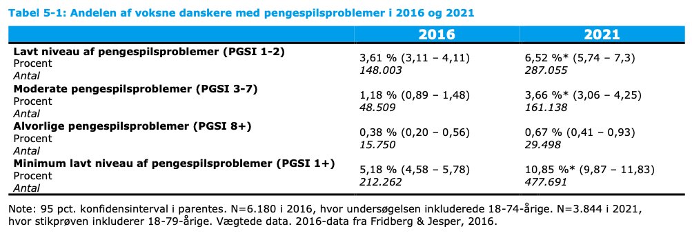 Andelen af personer med alvorlige pengespilsproblemer var i 2016 på 0,4 procent, mens det i 2021 hed 0,7 procent. I rapporten lyder det dog i denne sammenhæng, at tallet ”ikke er statistisk signifikant, idet forskellen mellem de to procentsatser er inden for den statistiske usikkerhedsmargin.”