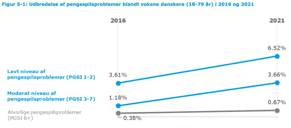 Det er særligt de to første kategorier, som har oplevet en stor stigning. Fra 2016 til 2021 er andelen af pesoner med et lavt niveau af pengespilsproblemer steget fra 3,6 procent til 6,5 procent. Det svarer til en stigning på 80 procent. Det konkrete antal personer i kategorien er steget fra 148.000 til 287.000.