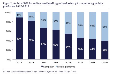 Hvor kun 11 procent af spilforbruget på onlinekasino og online væddemål foregik på mobile platforme i 2012, var denne andel steget til 61 procent i 2019.
