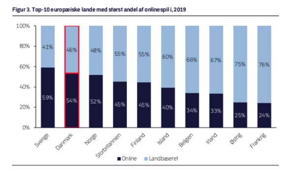 Sammenligner man med andre europæiske lande, er det kun Sverige, som har en større andel af spil, der sker online, end i Danmark. Her er 59 procent af spilmarkedet online. De tre nordiske lande Sverige, Danmark og Norge er de eneste lande, hvor halvdelen eller mere af spilforbruget sker online.