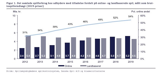 De seneste tal fra Spillemyndigheden viser, at 54 procent af danskernes spil i 2019 var på online platforme. Til sammenligning var tallet 31 procent i 2012. Det skriver Spillemyndigheden i en pressemeddelelse, som BetXpert har fået eksklusiv indsigt i.