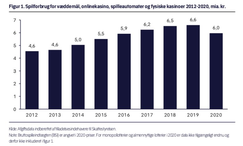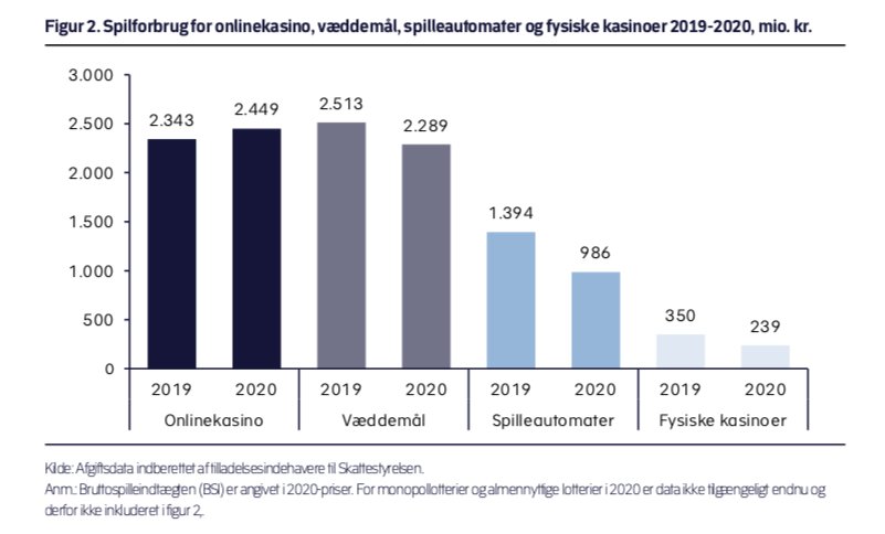 Her fremgår det blandt andet, at danskerne spillede mindre end i 2019. Dette ikke mindst forårsaget af nedlukning af fysiske spillehaller og kasinoer og en tørlægning af næsten al professionel topsport som en konsekvens af pandemien.