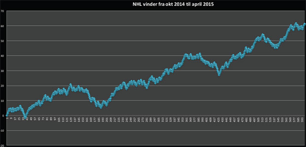 Billedtekst: Her ses en kurve over Peter Seebergs private spil fra NHL-sæsonen 2014/15. To tredjedel af spillene er af typen "monyline" og gevinstchancen er altid minimum 48 procent. Kurven er pæn og opadgående med få svingninger undervejs. Han høstede et overskud på 61,22 units med en tilbagebetaling på 110%.