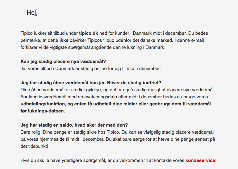 "Tipico lukker sit tilbud under tipico.dk ned for kunder i Danmark midt i december. Du bedes bemærke, at dette ikke påvirker Tipicos tilbud udenfor det danske marked," står der i starten af mailen.