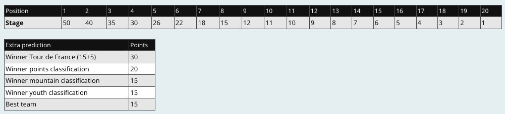 Konkurrencen går ud på, at du skal udvælge 15 Tour de France-ryttere, som du tror, vil gøre det godt under den forestående Grand Tour.