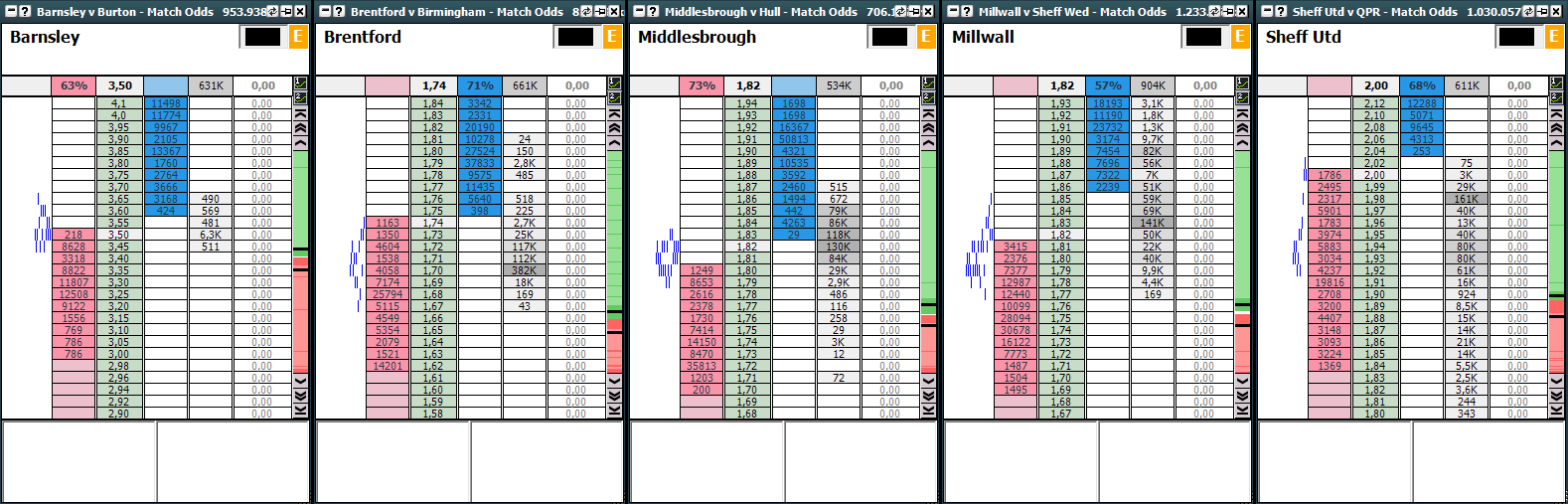 Herover ses et screenshot fra en enkelt tirsdag aften (20/2), hvor fem hold i The Championship lå i oddslejet 1,50-2,00. Selvom kampene ikke alle startede præcis samtidig, er billedet taget, hvor alle kampe var in-play mellem 2:00 og 3:00. De små blå lodrette streget til venstre for de fem røde kolonner viser handler foretaget på det givne oddsniveau, siden markedet blev åbnet ca. 1 minut før kampstart.