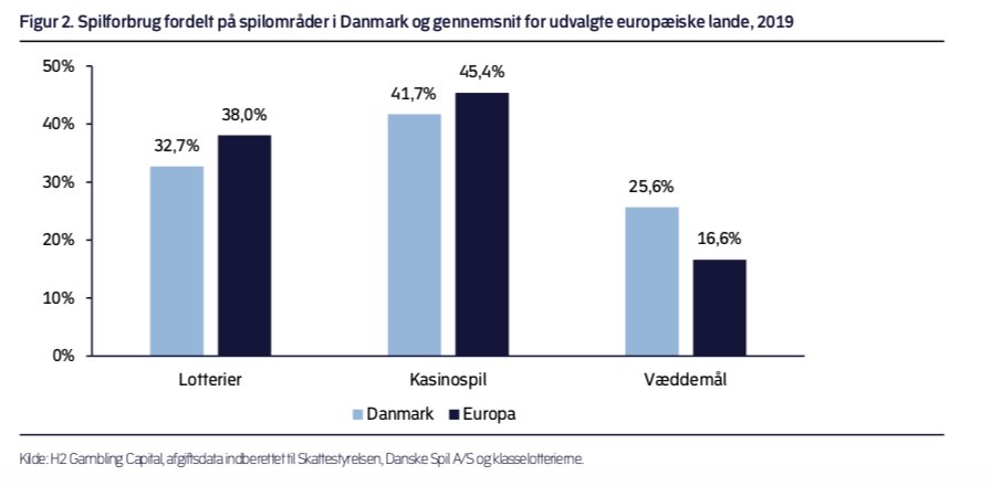 Hvor vi som nation stikker særligt ud er ved sportsvæddemål. Her er vi det land, der bruger den største andel af vores spil på kategorien. Helt præcist drejede det sig i 2019 om 25,6 procent. Gennemsnittet i Europa var på 16,6 procent.