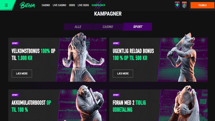 Som ny spiller hos Betinia kan du modtage en 100% velkomstbonus op til 1000 kr. til sportsbetting, når du opretter dig. Du finder også velkomstbonus til både casino og livecasino. Derudover er der masser af kampagnetilbud hos Betinia.