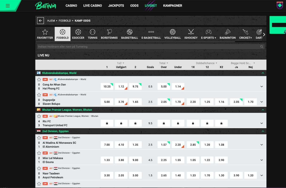 Ligesom alle andre bookmakere tilbyder Betinia også live betting. De tilbyder et stort udvalg af live odds på sportsgrene som fodbold, tennis, ishockey og basketball, men også på e-basketball, esport, bordtennis, badminton, dart og meget andet.