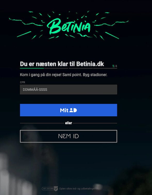 Det er nemt og hurtigt at oprette en spillekonto hos Betinia. Men man kommer ikke langt uden Mit-ID. Billedet herunder viser, hvordan det ser ud, når man trykker på "Tilmeld" oppe i højre hjørne på hjemmesiden. For at oprette sig hos Betinia, skal man altså starte med at logge ind med Mit-ID.