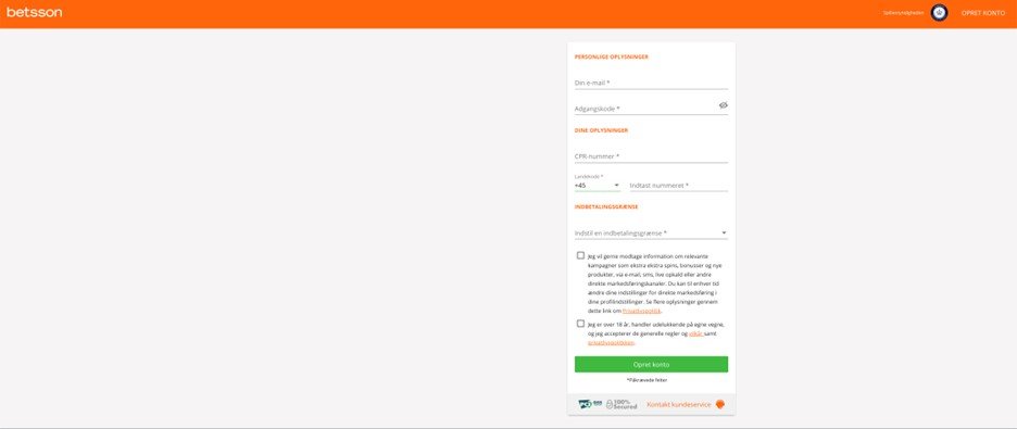 Vi oprettede en konto hos den nye Betsson udbyder og det gik omtrent lige så hurtigt som på enhver anden udbyder på det danske marked. Efter få minutter var kontoen oprettet uden større forsinkelser eller komplikationer. Ved at klikke på ikonet ‘Opret konto’ markeret med grønt i øverste højre hjørne af hovedsiden, kommer man ind på følgende startside i kontooprettelsesprocessen. Herefter guides man igennem de forskellige trin for kontooprettelse: