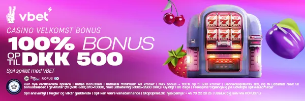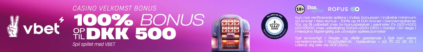 Min. 18 år. Kun nye spillere. Regler og vilkår gælder. Spill ansvarligt. Servudelukkelse via ROFUS. Kontakt Spillemyndighedens hjælpelinje på StopSpillet.dk Min. Indbetaling er 75 kr. Omsætningskrav x10, indenfor 60 dage på spillemaskiner. F.eks. indbetal 100 kr. omsæt 1.000 kr. og få 100 kr. Tilbuddet udbetales i kontanter. Komplette vilkår.