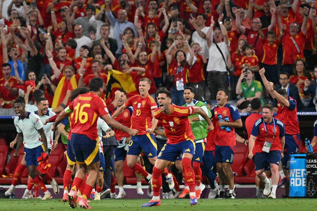 Foto: Spaniens fodboldlandshold fejrer sejr i semifinalen ved EM 2024. Copyright: MIGUEL MEDINA / AFP