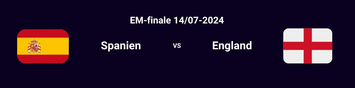 D. 14. juni kulminerer EM i fodbold 2024, når Spanien og England møder hinanden i finalen på Olympiastadion i Berlin. Hvem af de to nationer kan kalde sig selv for europamester 2024, når det sidste fløjt lyder søndag aften? Spanien, som har været det bedst spillende hold ved dette EM, er favoritter til at vinde kampen. Men de får det langt fra nemt mod Englands mange stjerner. Her kan du se odds på Spanien - England og læse vores optakt til den spændende EM-finale på søndag.