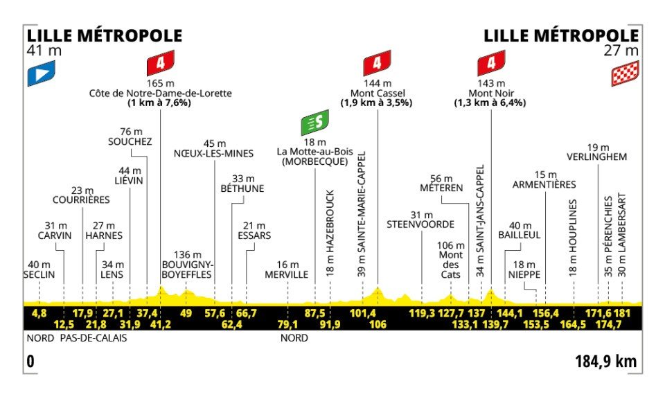 Der er tre kategoriserede stigninger på etapen (Notre-Dame-de-Lorette, Cassel og Mont Noir), og selvom de er korte, kan de: