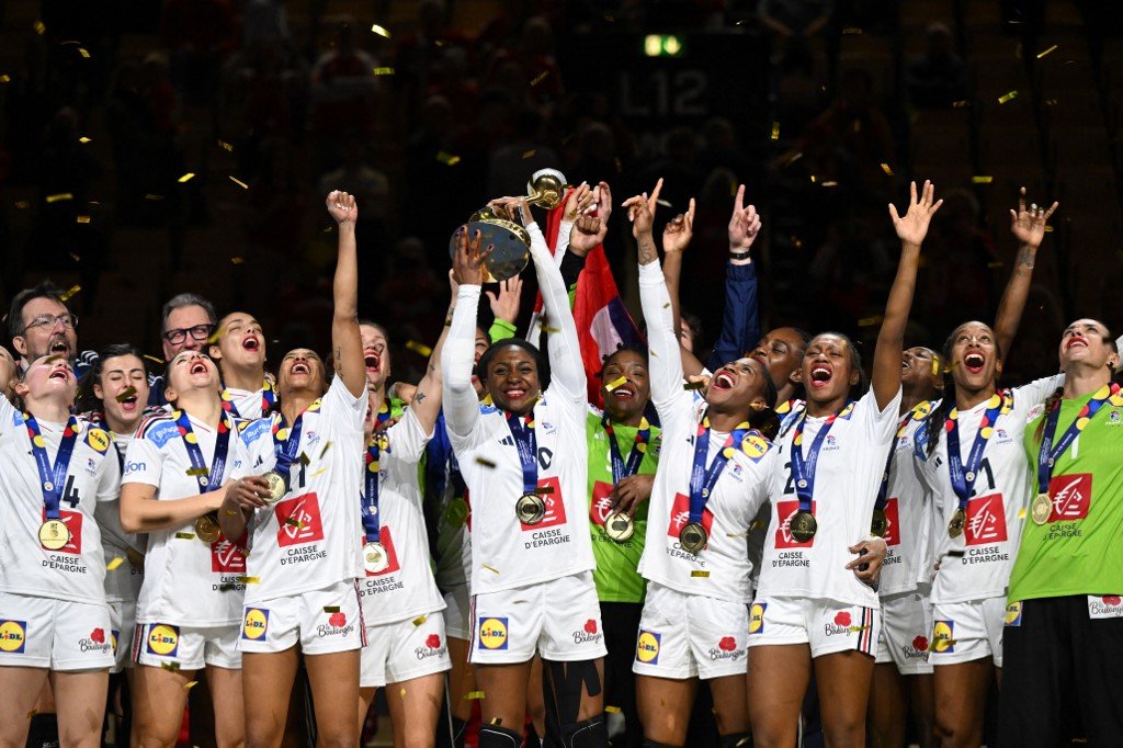 Foto: Frankrigs håndboldkvinder fejrer VM-guld i 2023. Copyright: JONATHAN NACKSTRAND / AFP