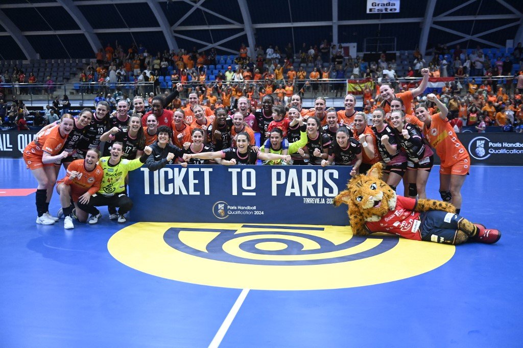 Foto: Spaniens og Hollands håndboldkvinder fejrer deres kvalificering til OL i Paris 2024. Copyright: JOSE JORDAN / AFP