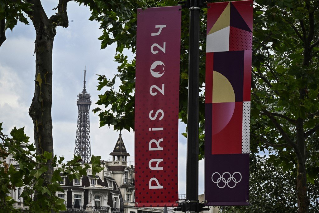 Foto: OL 2024-banner i Paris med Eiffeltårnet i baggrunden. Copyright: JULIEN DE ROSA / AFP