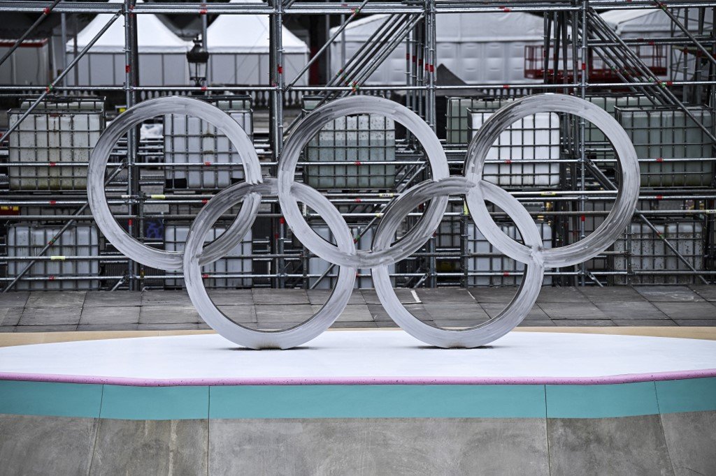Foto: De olympiske ringe ses ved den skatepark, der er under opførelse til de kommende olympiske lege i Paris 2024 på La Concorde Urban Parc-grunden i Paris den 3. juli 2024. Copyright: JULIEN DE ROSA / AFP
